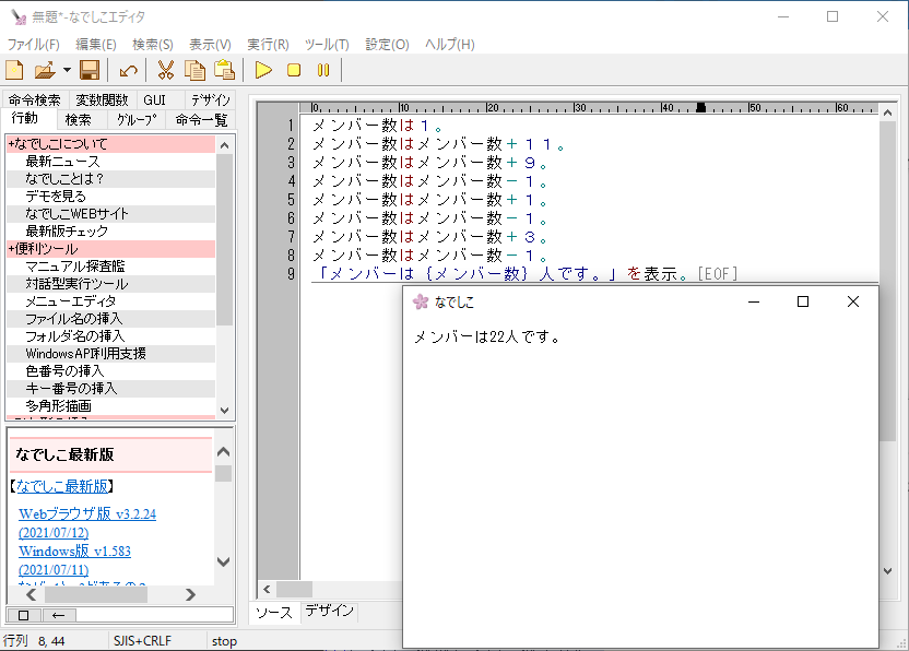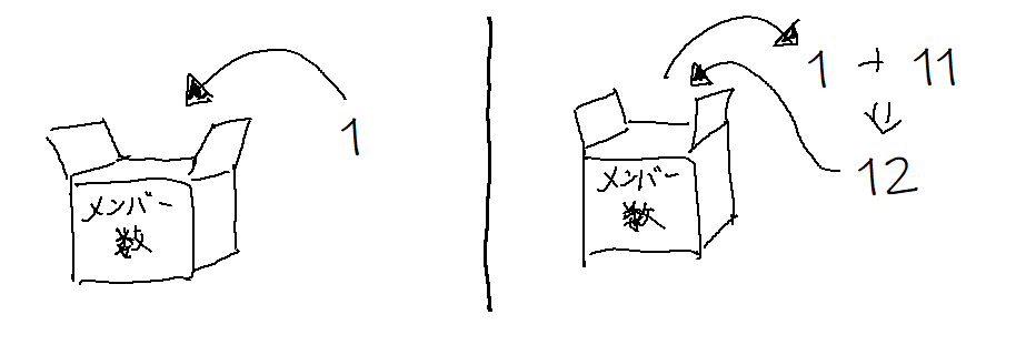 2行目で、『メンバー数』に入った「1」に11を足した「12」を『メンバー数』に入れなおしています。3行目以降も同様に、『メンバー数』の値に足したり引いたりして代入し直しています。