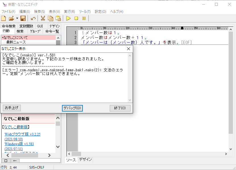 なでしこでは、定数名の先頭に「!」を付けることで定数の宣言となります。