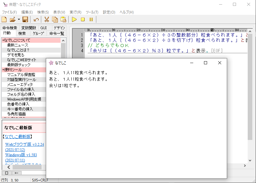 「あと、1人{(46-6×2)÷3の整数部分}粒食べられます。」と表示。