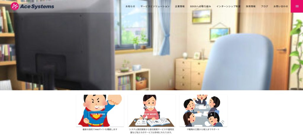 従来の「NEWS」「SERVICE」「RECRUIT」メニューは、画面を下にスクロールすれば表示されます。